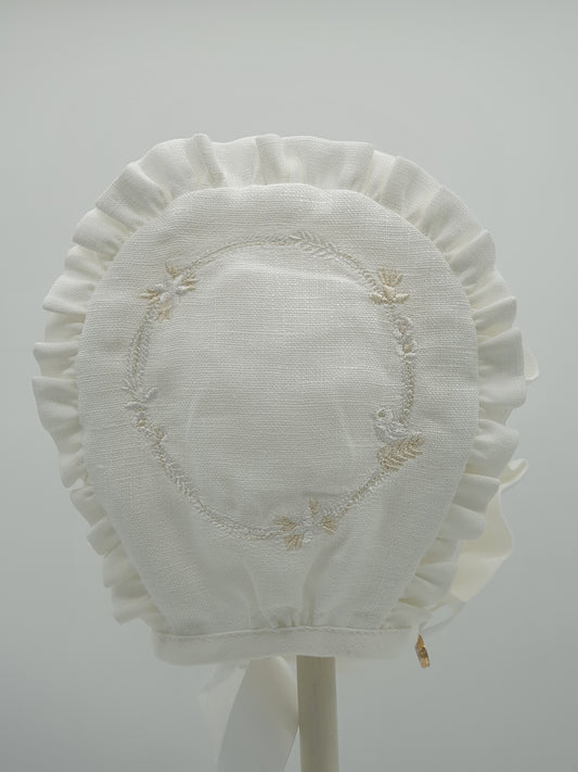 Small Dreams Exclusive Bonnet, White Linen with embroidery