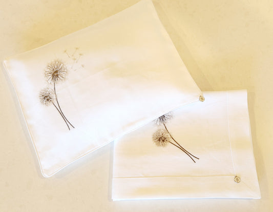 Exclusive Baby Wrap & Pillowcase Set, White Linen with embroidered dandelions