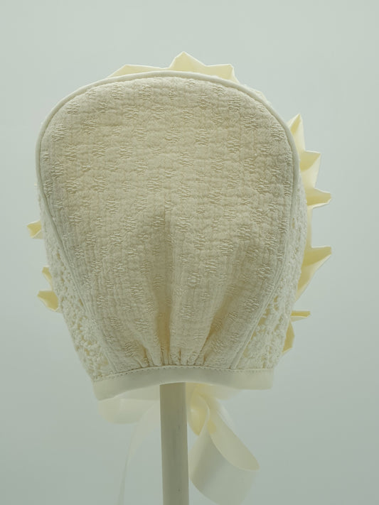 Exclusive Bonnet, Cream Snowflake lace with frill