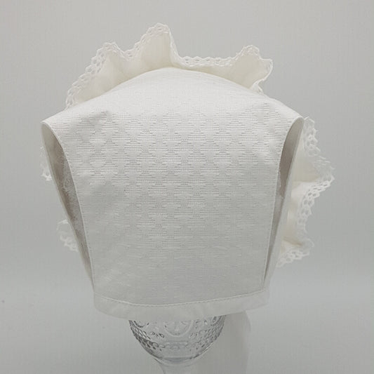 Exclusive Bonnet, White Jacquard T-Bar Style with frill & cluny laceRegular price $55.00 AUDRegular priceUnit price per-