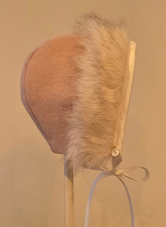 Exclusive Wool Cashmere Bonnet, Cap Style with Speckled Snow Fur Brim, Musk