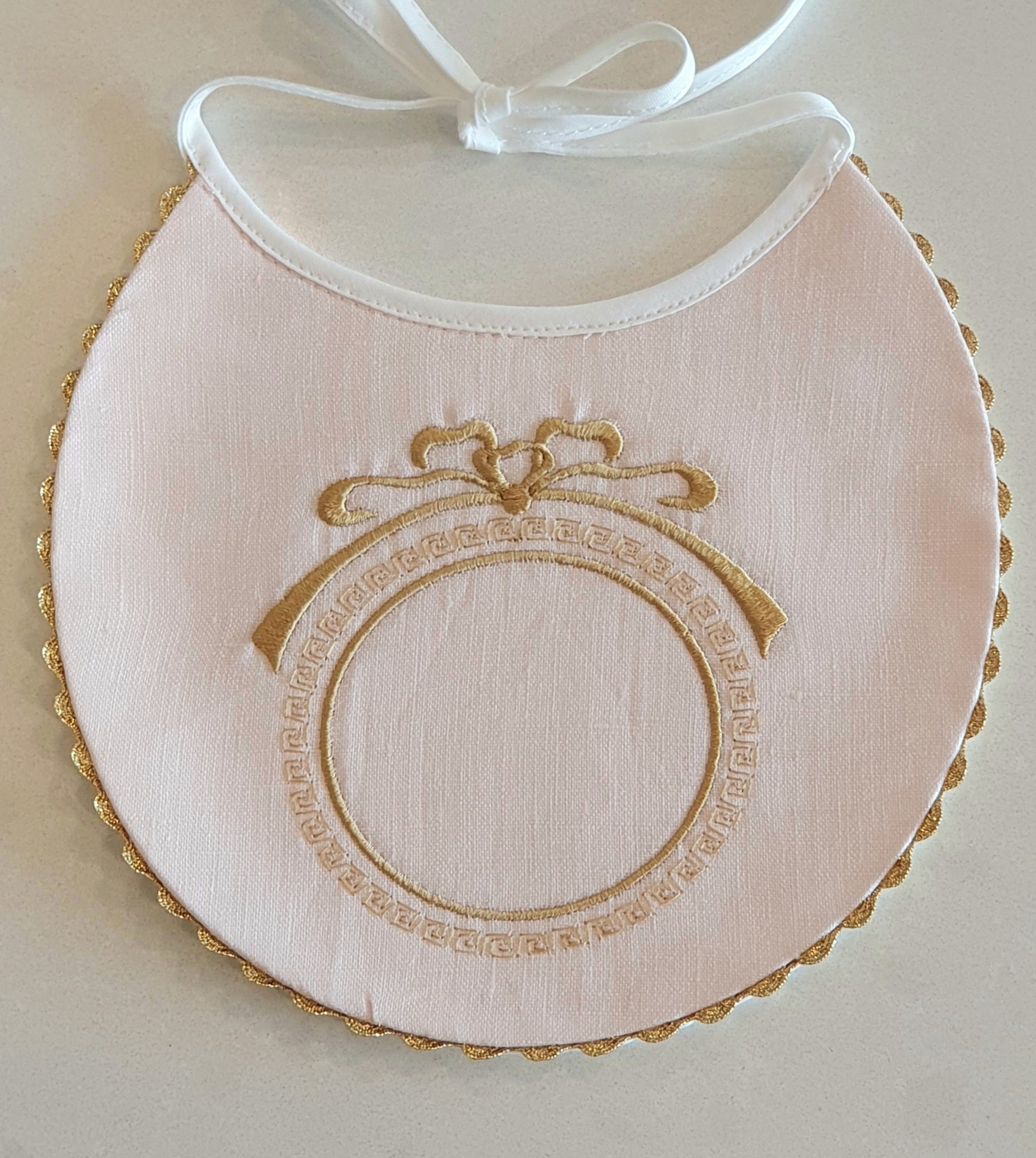 Gold wreath with bow and gold trimming around bib.