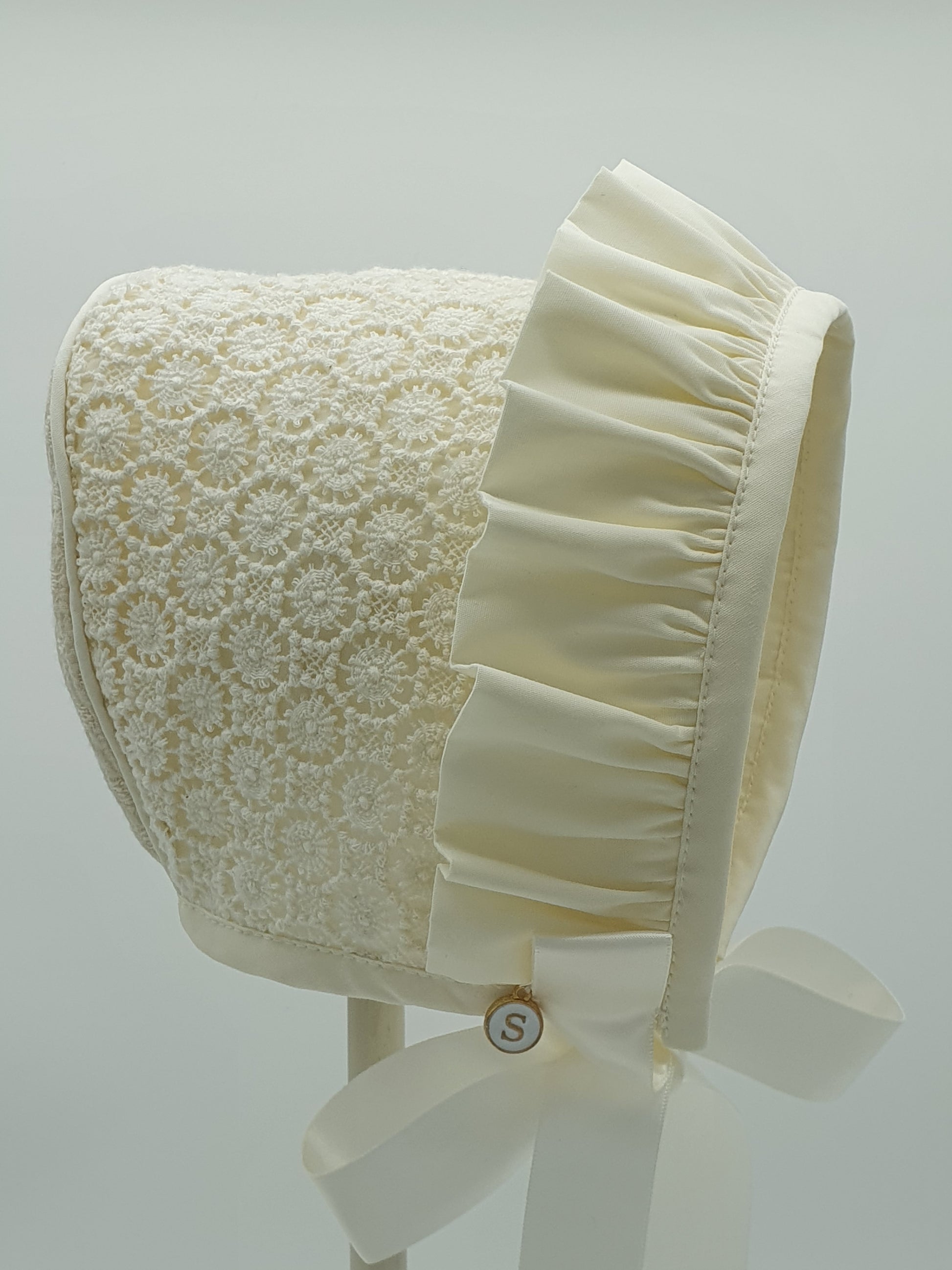 Exclusive Bonnet, Cream Snowflake lace with frill
