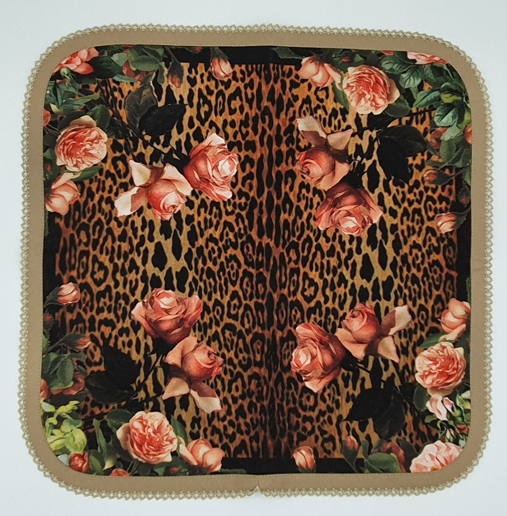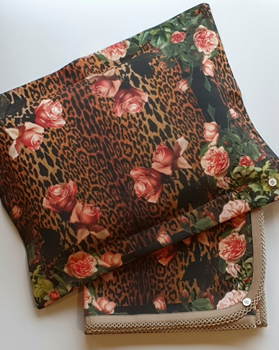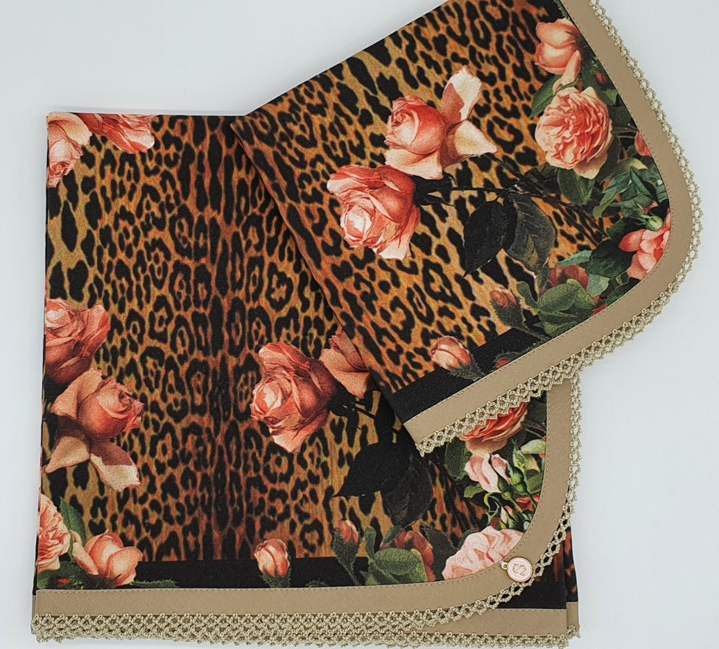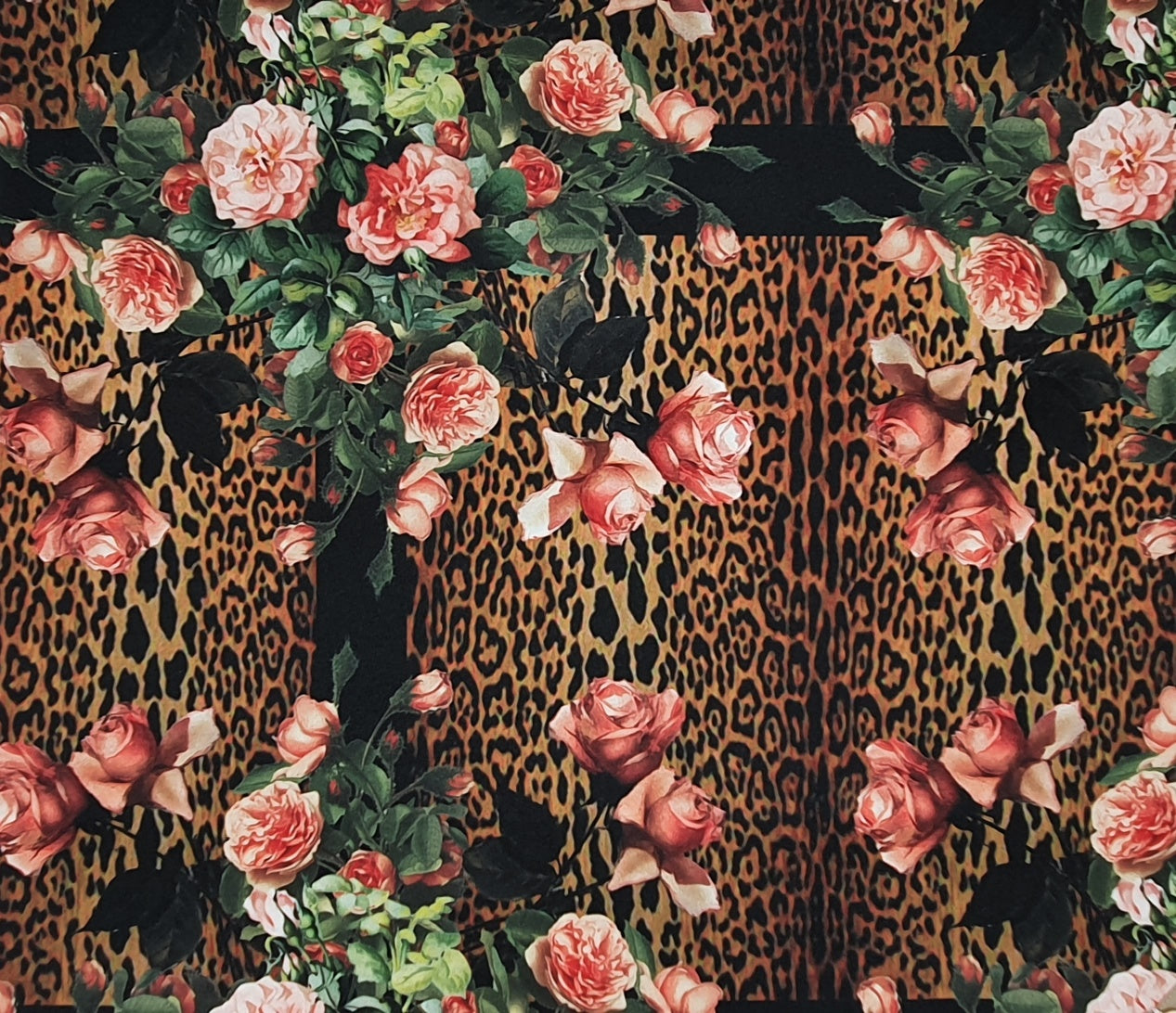 'A dramatic love scene with gorgeous roses on a leopard background'
