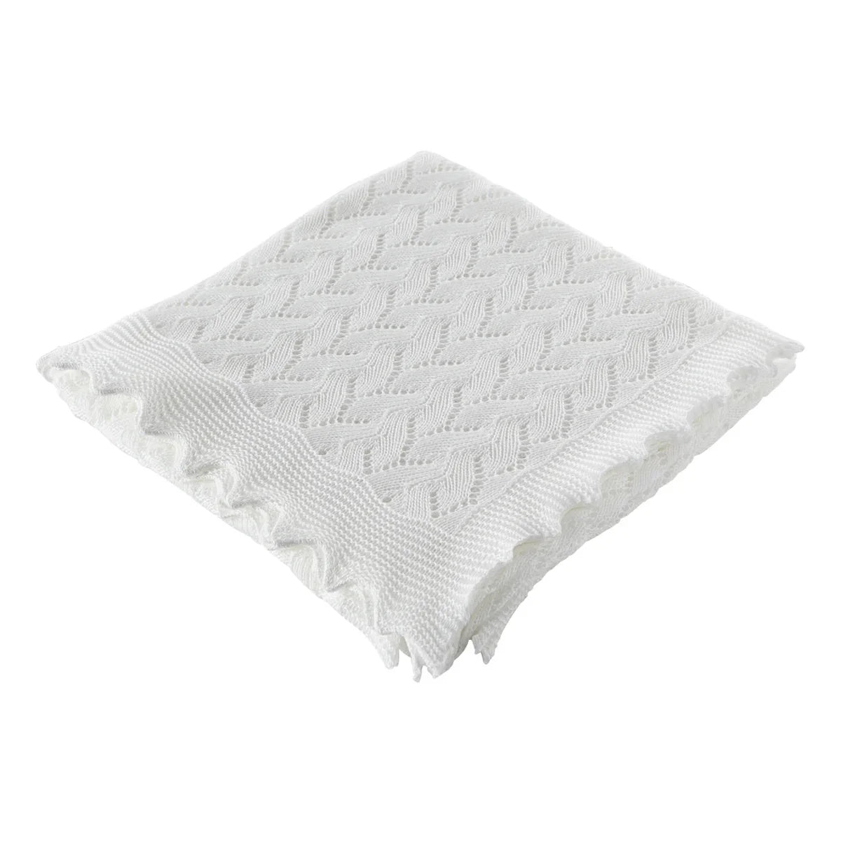 Pure white 100% cotton baby shawl in pretty allover lace pattern, with purl edge detail.