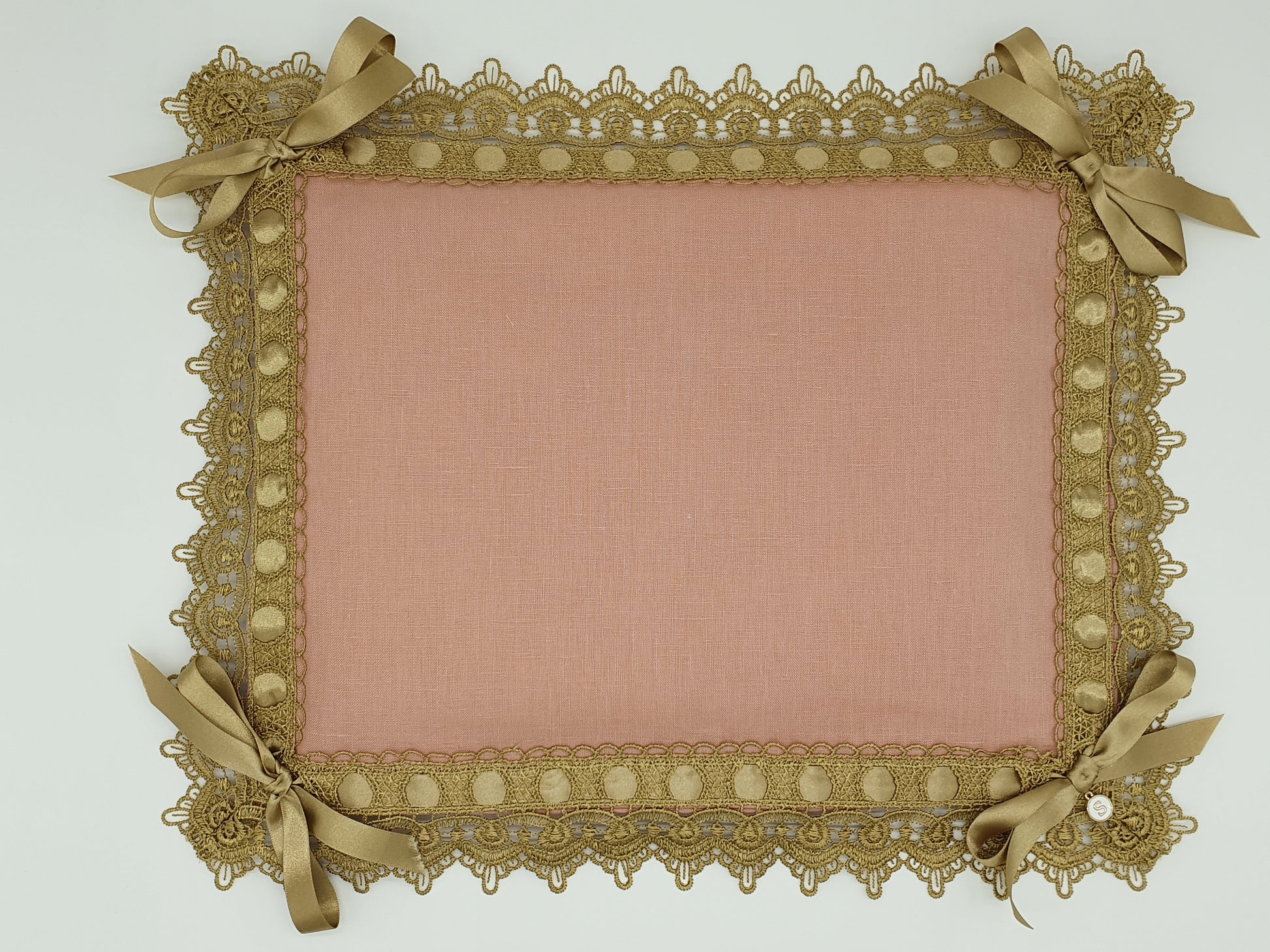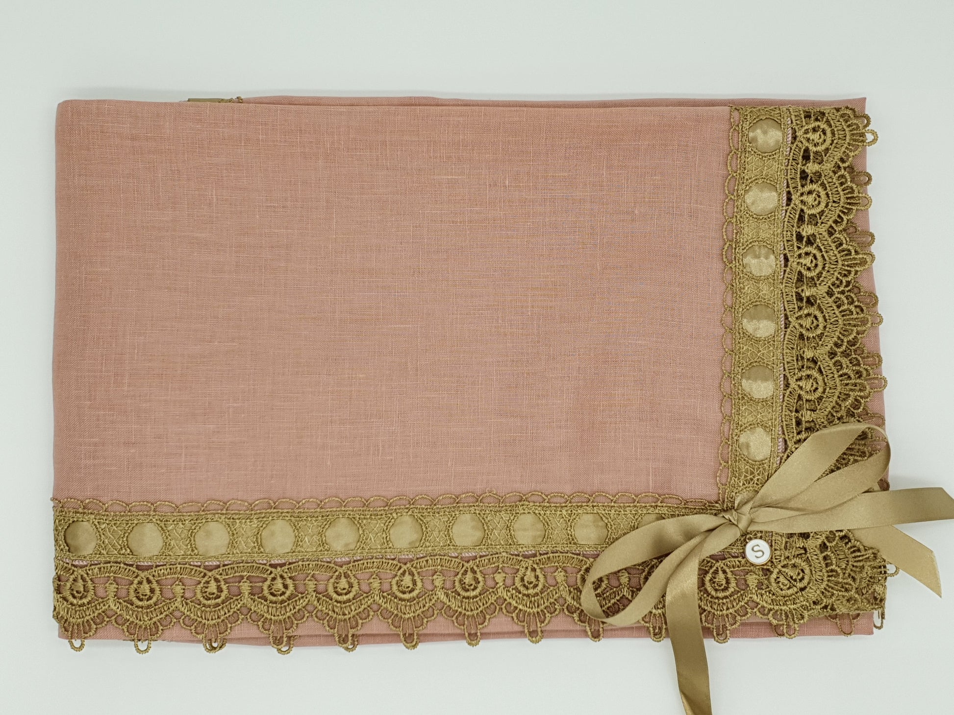 Vintage Rose Linen Wrap & Pillowcase Set trimmed with Antique Gold ribboned lace.